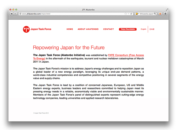 JTF (Japan Task Force) was a coalition of Japanese, European, American and Middle Eastern energy experts. Its mission was to help the Japanese leaders find and transition into reliable, economically viable, and environmentally sustainable energy sources in the aftermath of the tragic 2011 Tōhoku earthquake and tsunami.